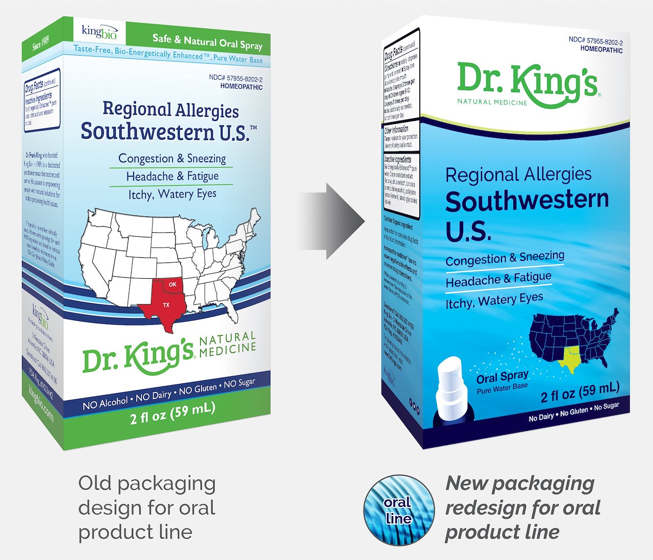 Project: New retail packaging line redesign for Dr. King’s Natural Medicine Oral Spray line (carton rendering pictured).