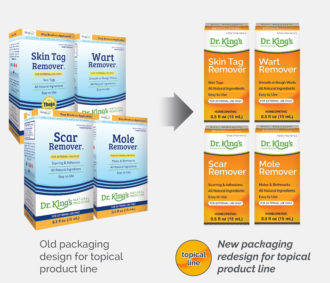 Project: Retail packaging line redesign for Dr. King’s Natural Medicine Topical Oil line (carton renderings pictured).